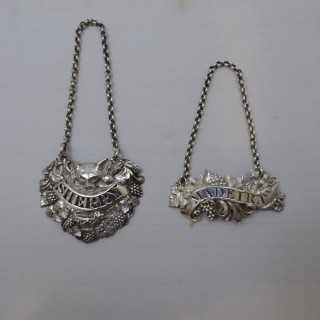 編號: K068 價格: $16,000 尺寸: 描述: 兩件喬治亞晚期/維多利亞時代的銀製酒標,一來自品牌Edward, John & William Barnard(倫敦)年份1836,另一件未標記,年代1820 一為葡萄藤蔓造型,並刻有MADEIRA,另一款上有花豹的頭、獎盃與結實的藤蔓點綴,寬度6.8公分,50公克