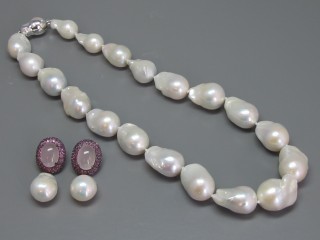 編號: JD250 價格: $160,000 尺寸: 描述: 18k白金珍珠項鍊與粉紅水晶珍珠耳環一對,項鍊由19顆珍珠組成 (16.5 mm to 14.0 mm) 珍珠耳環為14.7 mm,粉紅水晶以粉紅藍寶石裝飾