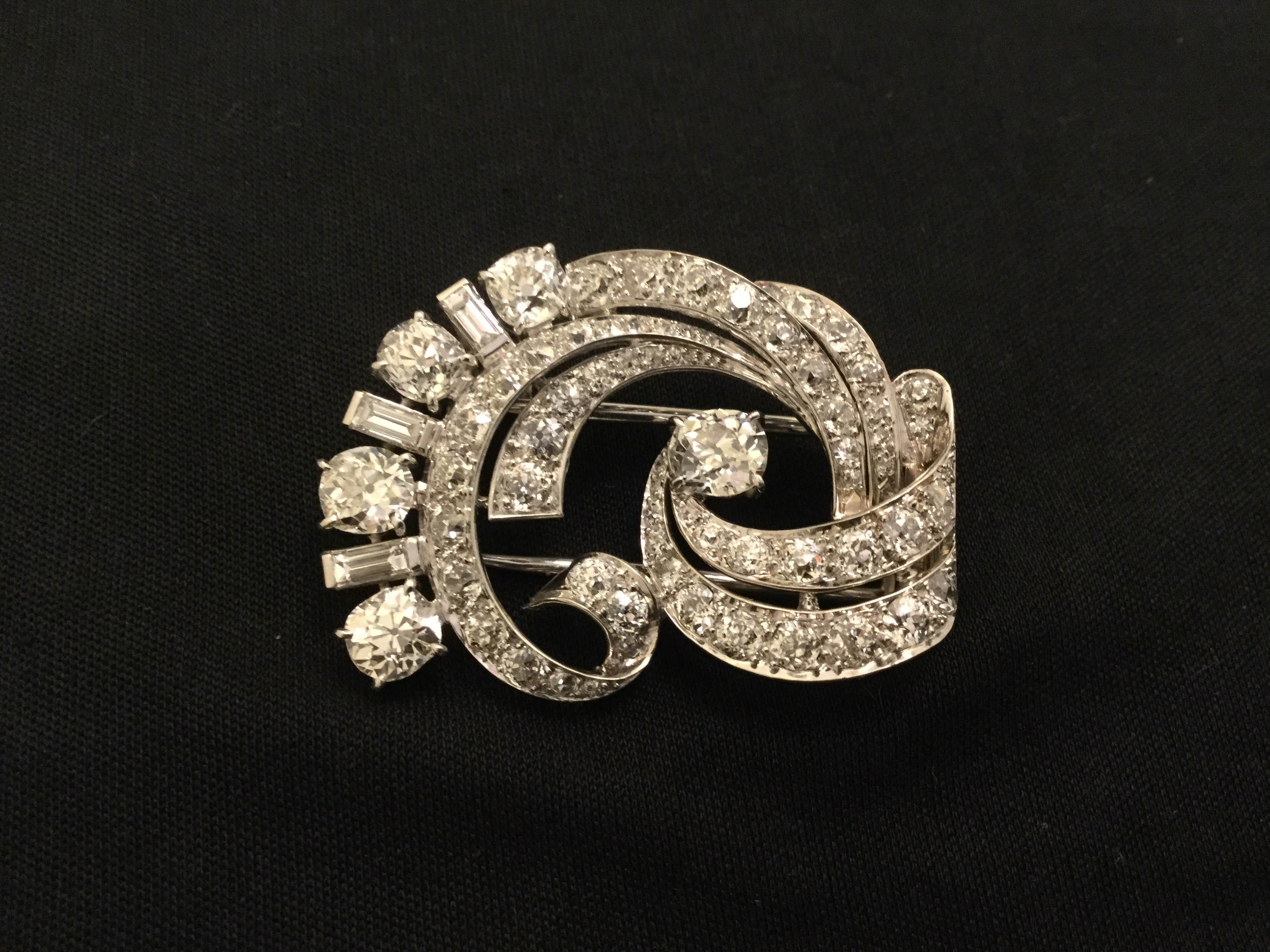 編號: JD180 價格: $246,000 尺寸: 描述: 6.50克拉鑽石胸針,約1920 5顆大鑽共約2.80克拉,顏色:F~H,淨度:VS2~SI2 其餘鑽石共約3.70克拉,顏色:F~H,淨度:VS1~VS2