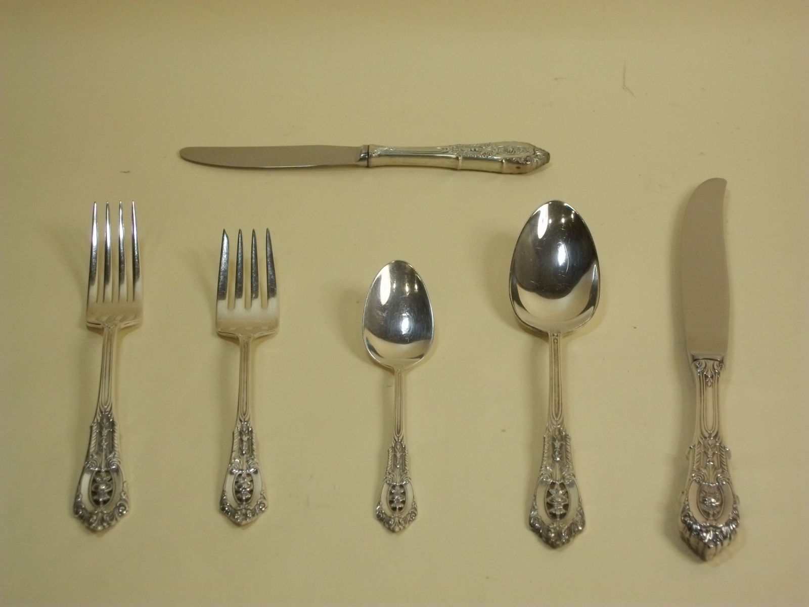 編號: K016 價格: $57,600 尺寸: 一套 6 組,一組 6 件,計 36 件 描述: Wallace EAmerican Silver ‘Rosepoint(純銀刀叉組) 一套 6 組,一組 6 件,計 36 件